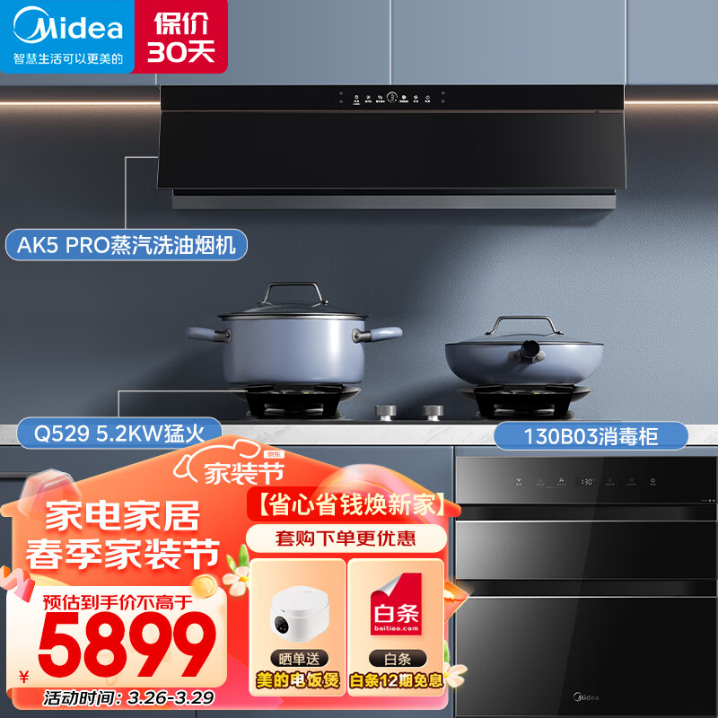 美的(Midea)抽吸油烟机烟消洗多件套高温蒸汽洗变频23风量AK5 PRO+Q529L+130B03价格:5899.00元!