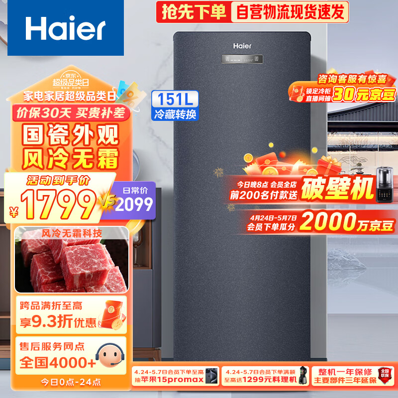 海尔(Haier)国瓷系列 151升风冷家用立式冰柜 冷藏冷冻柜抽屉式冷柜小冰柜家用小型冰箱BD-151WGHEB以旧换新价格:1699.00元!