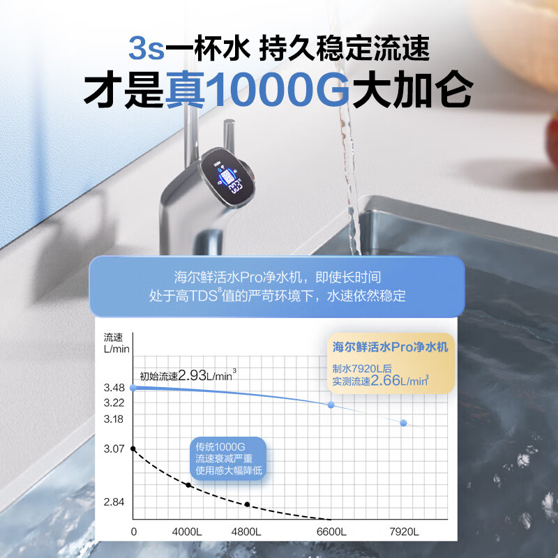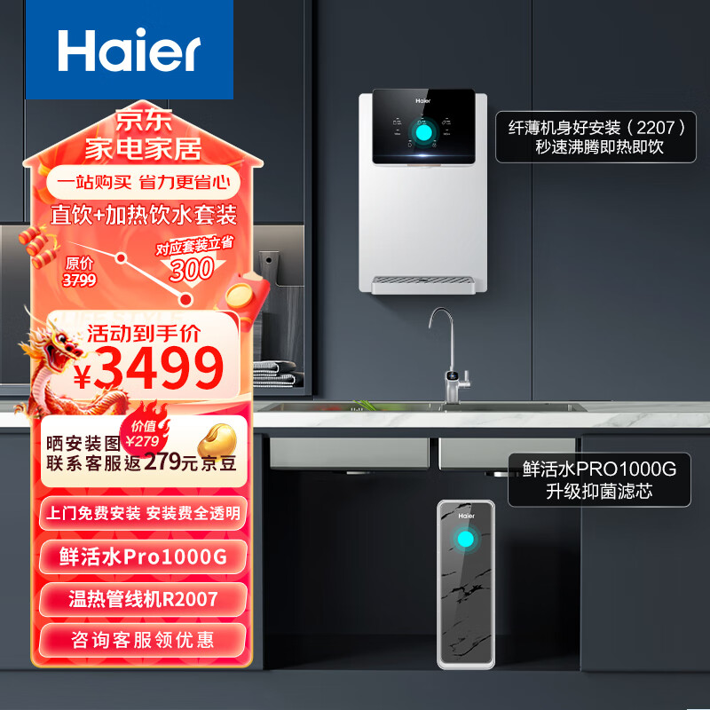 海尔(Haier)净水器1000G鲜活水pro家用净水机5年RO反渗透厨下直饮净水器+管线机HKC2400-R791D2U1+R2207价格:3499.00元!