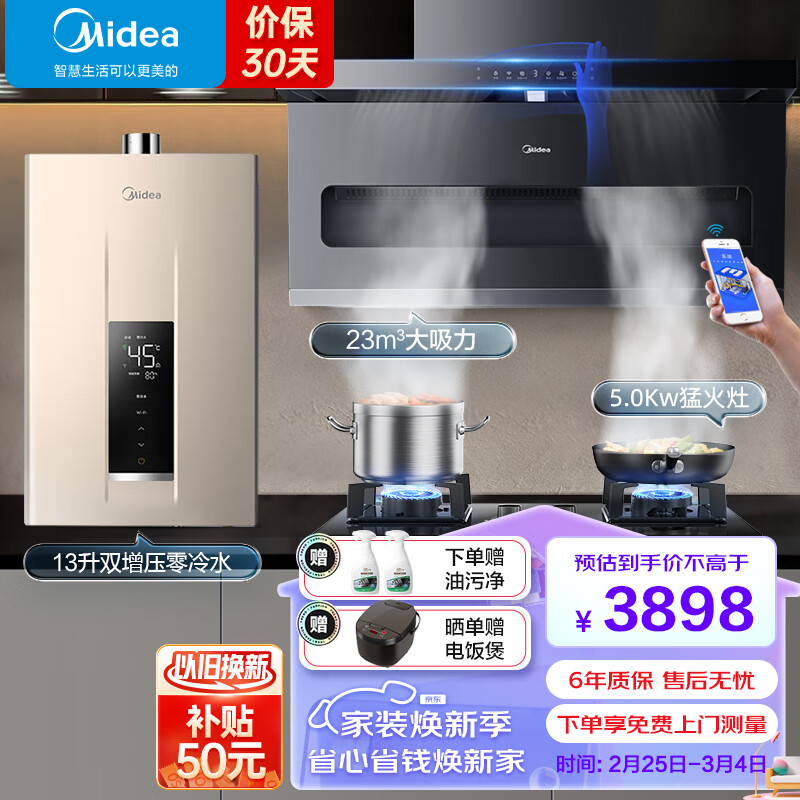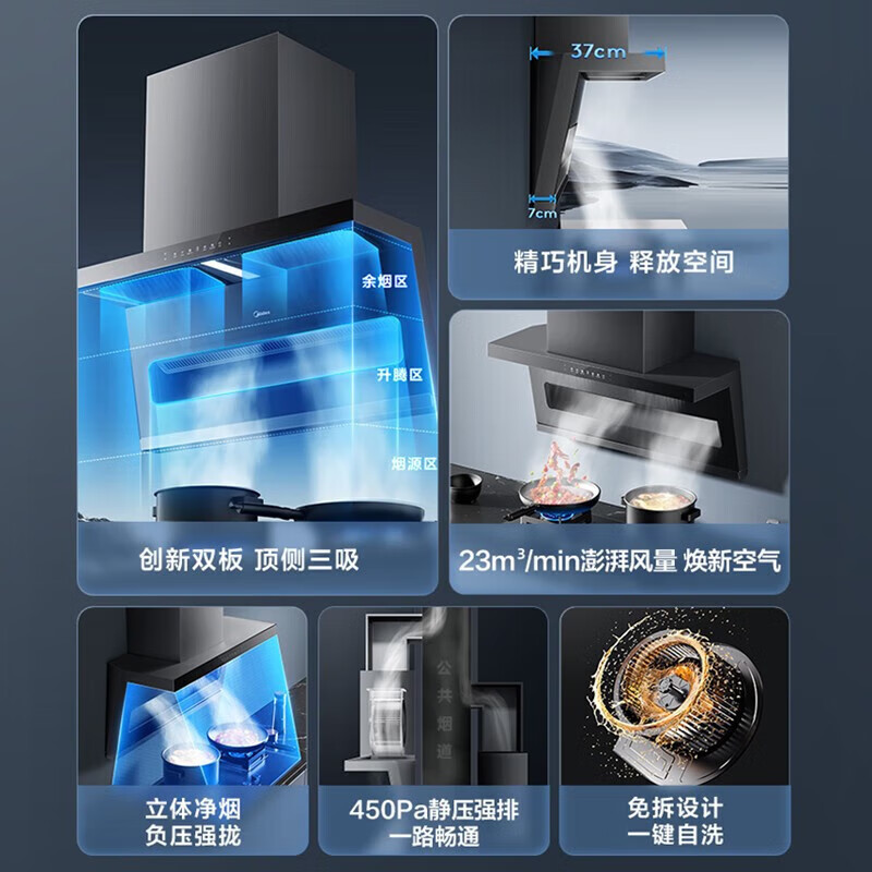 美的(Midea)油烟机顶侧双吸家用23立方大吸力挥手智控自清洁450pa静压抽油烟机 DP55+Q330+13升零冷水[家电]价格:3898.00元!