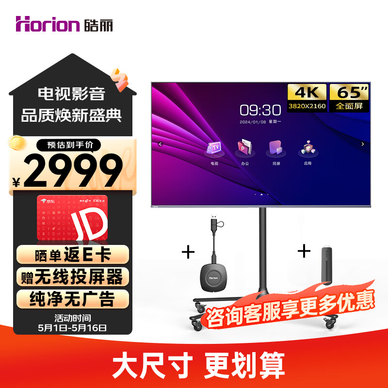 皓丽(Horion)65英寸会议平板电视一体机智慧屏投屏投影电视一体机商用显示会议室教学培训大屏65H5桌面底座价格:3099.00元!
