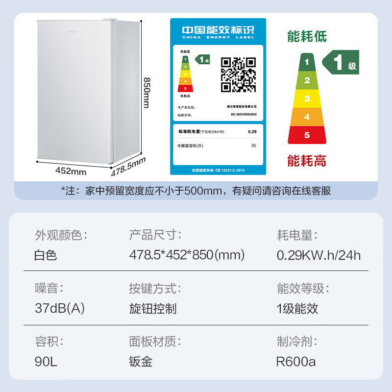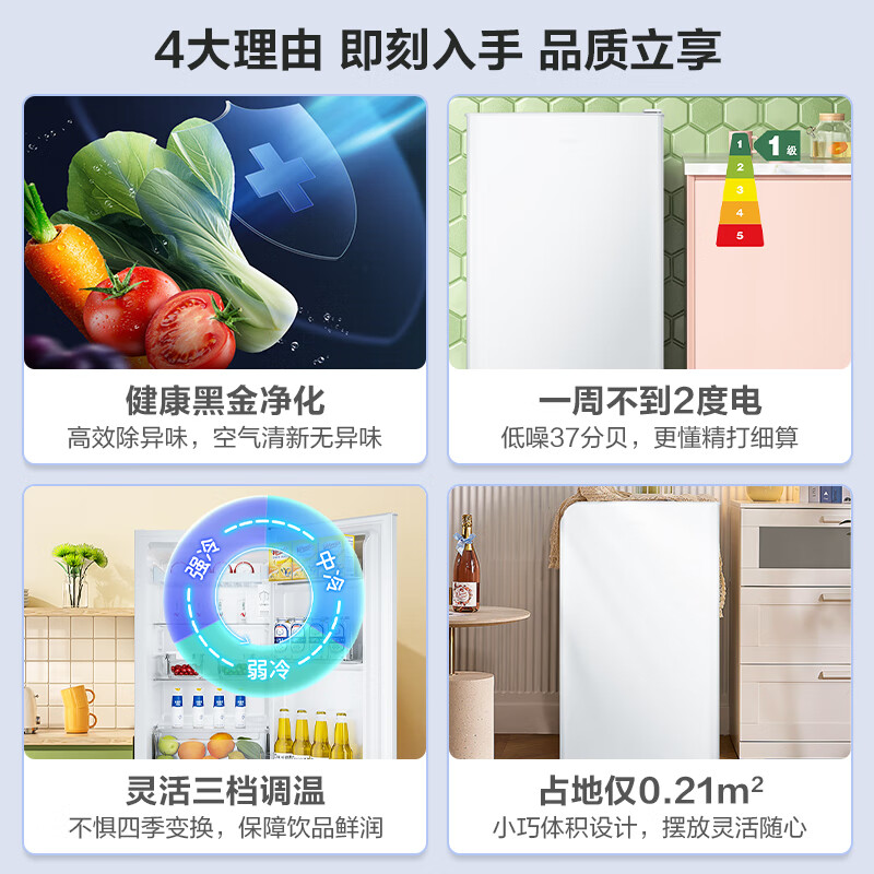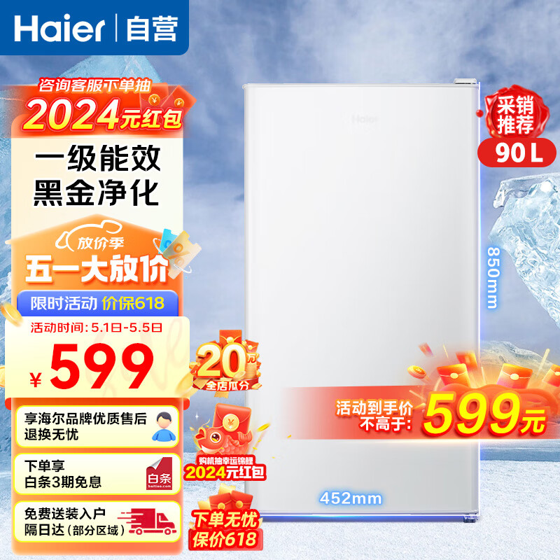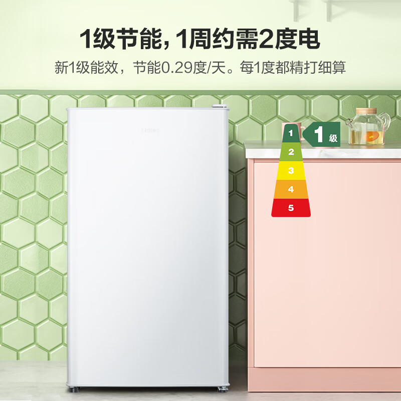 海尔(Haier)冰箱90升小型家用租房办公室床头冷藏保鲜单门冰箱一级能效节能黑金净化省电三档控温白色冰箱价格:599.00元!
