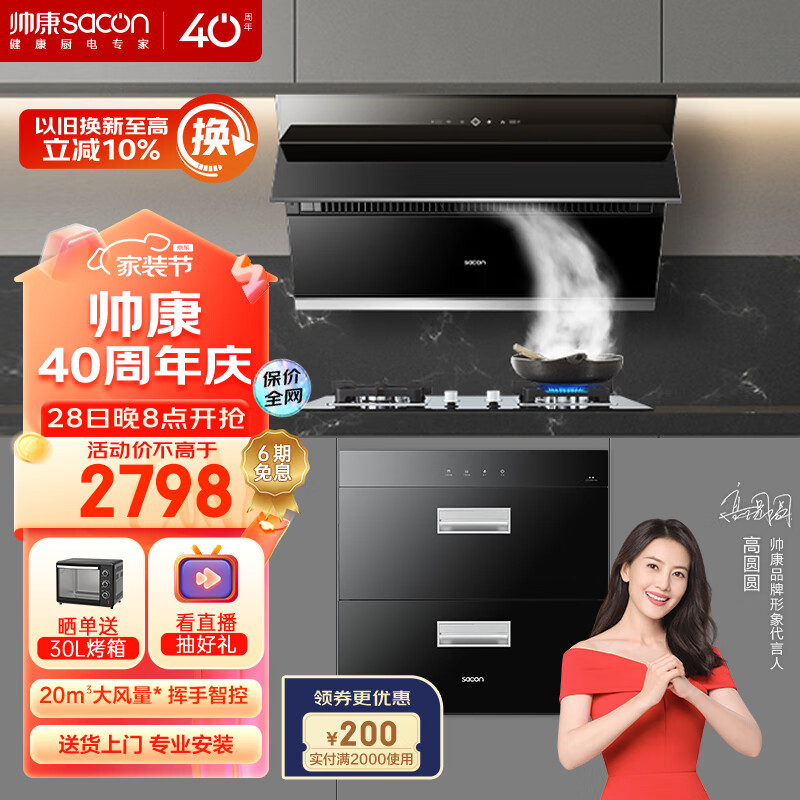 帅康(Sacon)抽油烟机 20风量家用侧吸式吸油烟机挥手智控自动清洗烟灶多件套 S8807S+61B+DS1天然气价格:2798.00元!