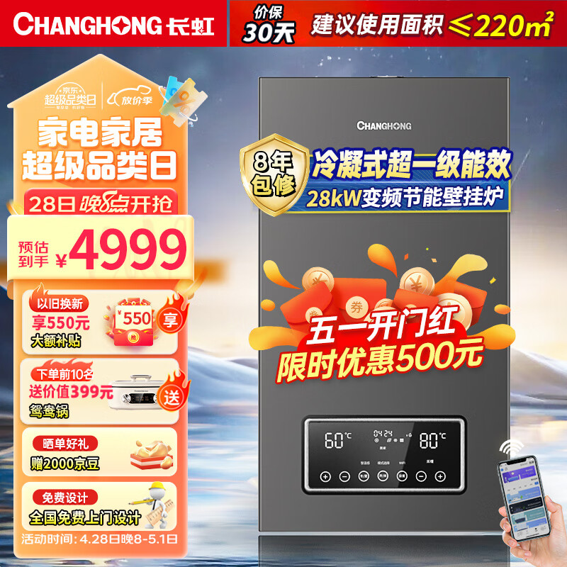 长虹(CHANGHONG)燃气壁挂炉家用天然气供暖淋浴一级能效冷凝式节能省气APP智控锅炉暖气片地暖热水两用恒温28C6价格:6699.00元!