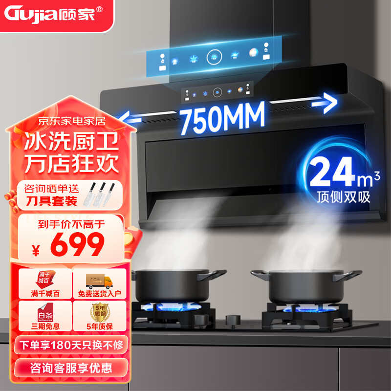 顾家(Gujia)顶侧双吸抽油烟机燃气灶烟灶套装家用厨房大吸力脱排式7字吸油烟机灶具套装 热销升级单机丨750mm宽+彩屏价格:1299.00元!