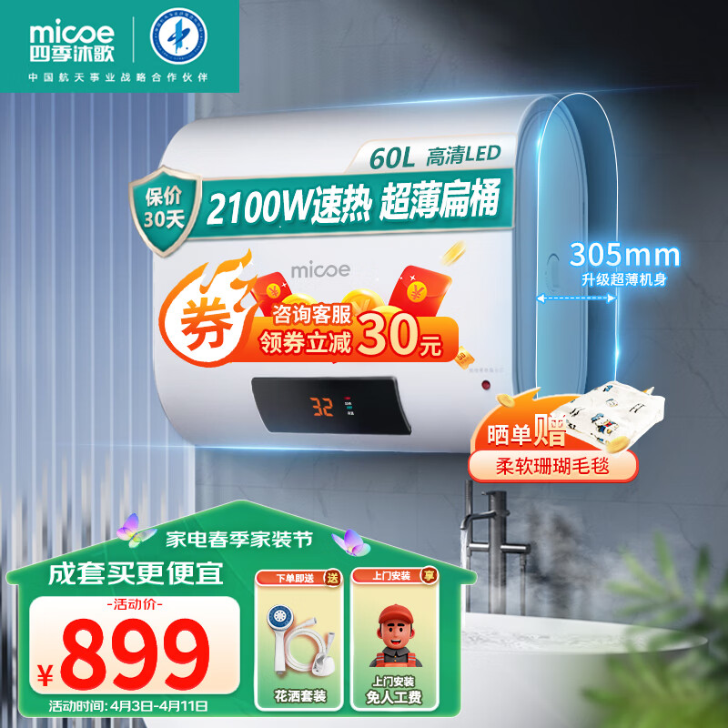 四季沐歌(MICOE)电热水器温度数显超薄储水式60L 速热2100W 家用扁桶适用3-4人 M3-S60-21-BH1价格:899.00元!