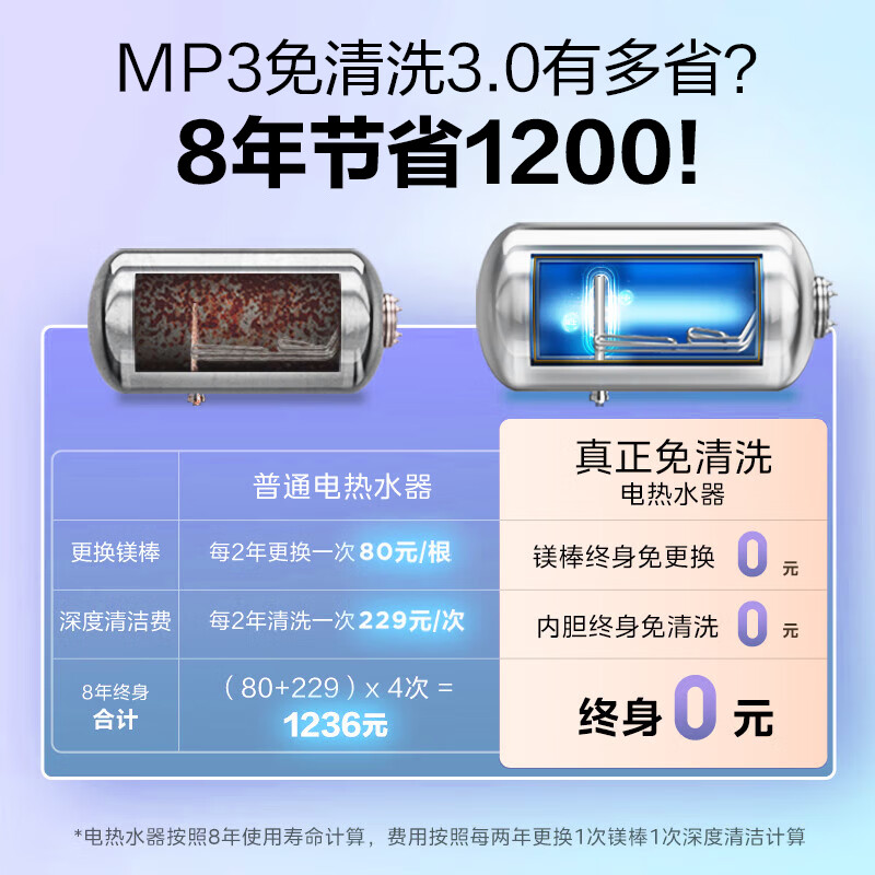 美的(Midea)储水式电热水器水电分离免换镁棒一级能效3300W速热7倍增容10重安防智能家用省电MP3系列 60L 3300W 免清洗瓷热舱MP3价格:1999.00元!