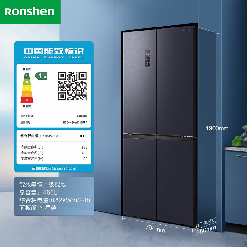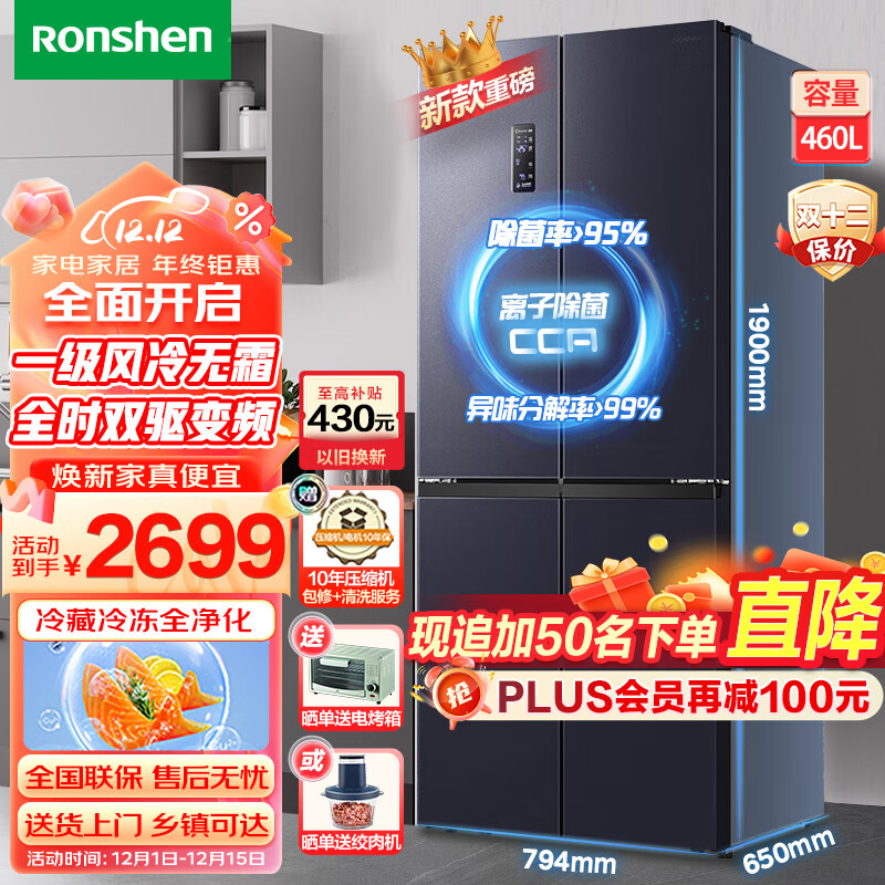 容声(Ronshen)冰箱四开门超薄嵌入式460升十字对开门变频风冷无霜家用电冰箱一级能效BCD-460WD12FPA价格:2699.00元!