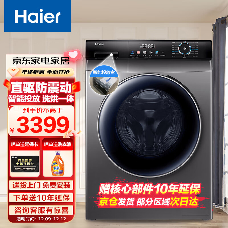 海尔(Haier)10KG滚筒洗衣机全自动家用大容量直驱变频一级能效智能投放空气洗烘一体机EG10012HBD55S[家电]价格:3299.00元!