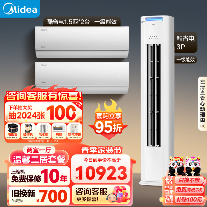 美的(Midea)空调 新一级能效 酷省电 空调套装 两室一厅 温馨二居套餐(1.5匹*2+3匹)价格:11497.00元!