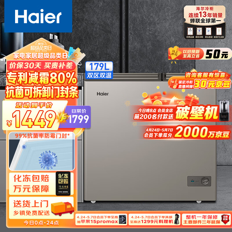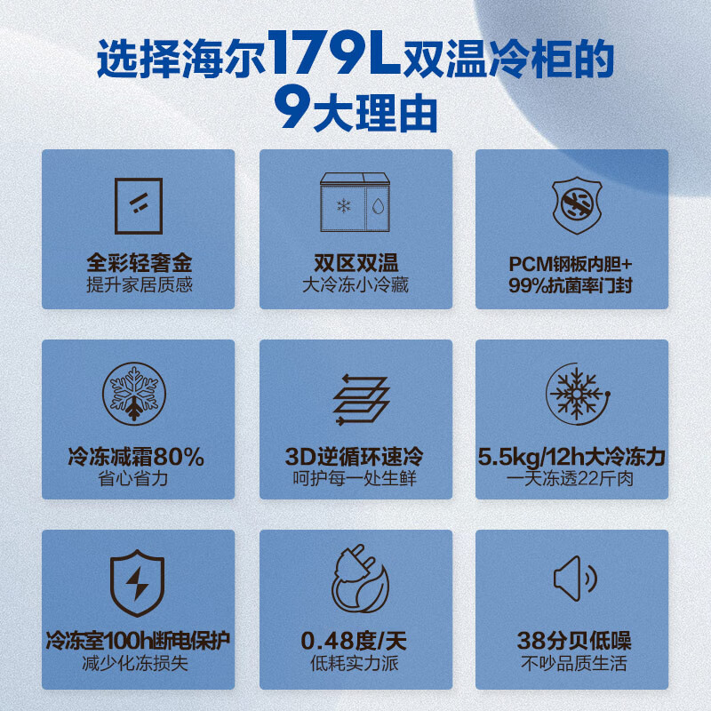 海尔179升双箱双温商用家用冰柜 大冷冻小冷藏卧式冰柜家用小型冰箱冷柜FCD-179GHXPCD以旧换新价格:1449.00元!