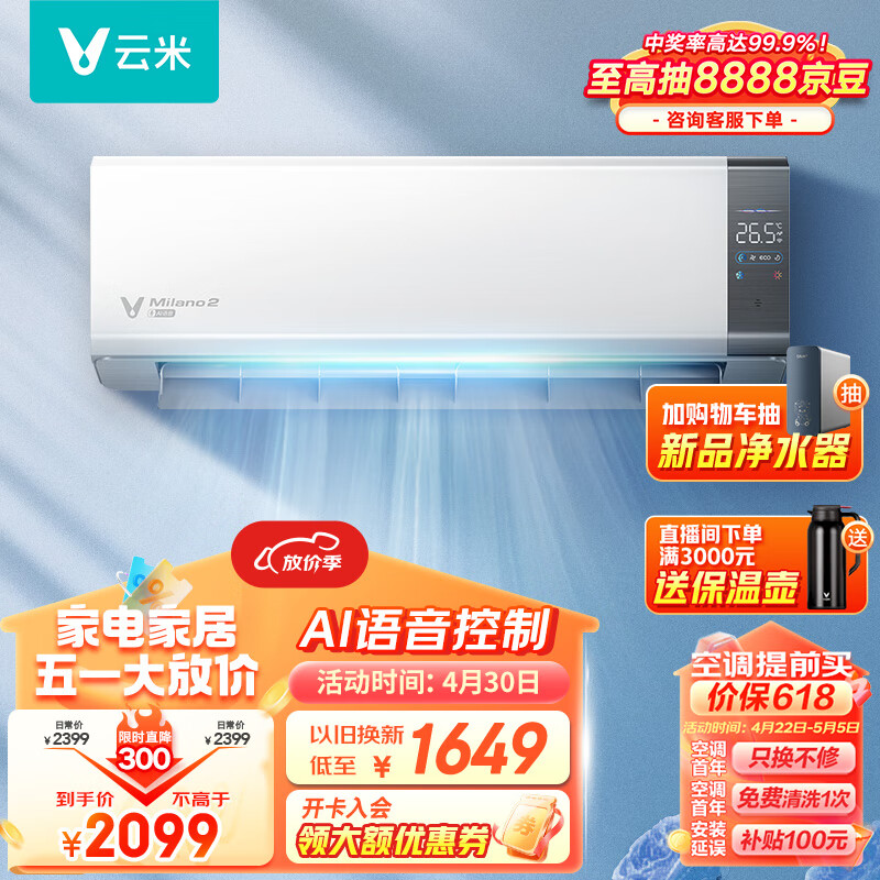 云米(VIOMI)1.5匹 智能变频冷暖 Super 2 米兰 AI语音控制 以旧换新 新一级空调挂机 KFRd-35GW/Y3YM6-A1价格:2099.00元!