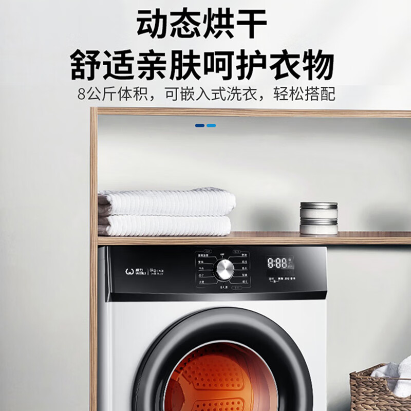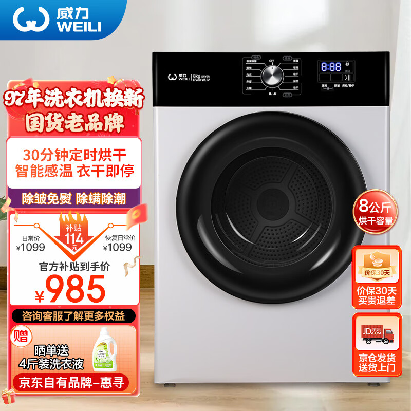 威力(WEILI)烘干机 直排式家用干衣机 衣干即停快烘30分钟 8公斤除皱免熨 智能感温不伤衣 DV80-WL1V价格:985.00元!