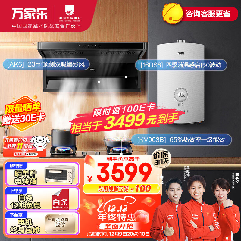 万家乐烟灶热三件套 23立方顶侧双吸油烟机16L变频水伺服燃气热水器套装AK6+KV063B+16DS8天然气价格:3799.00元!