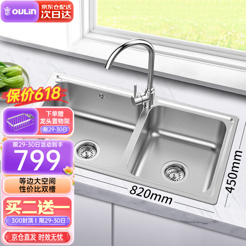 欧琳(OULIN)厨房水槽双槽304不锈钢洗菜盆加厚款大双槽+龙头套餐9813A价格:899.00元!