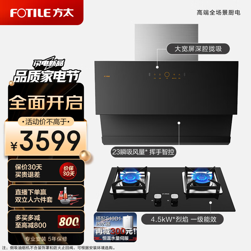 方太(FOTILE)抽吸油烟机灶具套装侧吸烟灶套装挥手智控23风量4.5kW燃气灶JCD10C+HT8BE.S(JCD10B/JCD10C混发)价格:3599.00元!