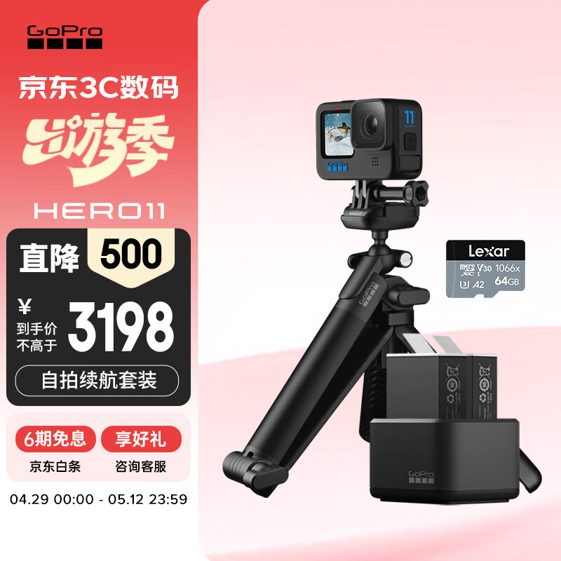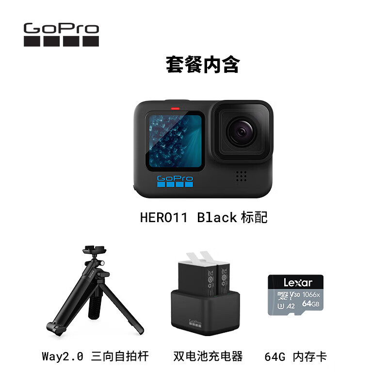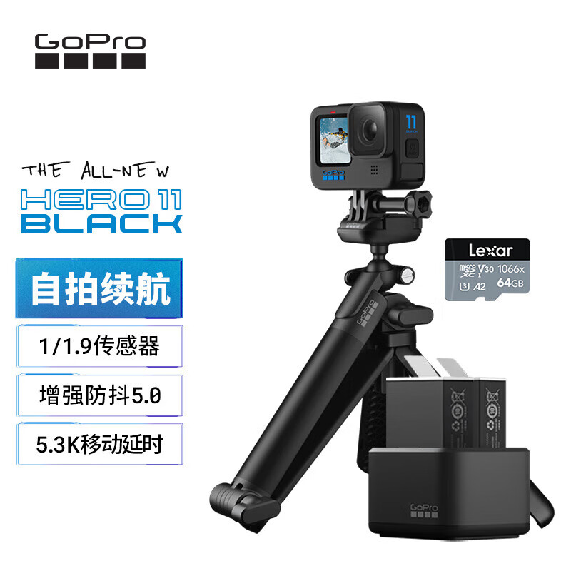 GoPro HERO11 Black运动相机 防抖防水相机 户外潜水滑雪照相机 自拍续航【三向2.0+Enduro双充+64G卡】价格:3198.00元!