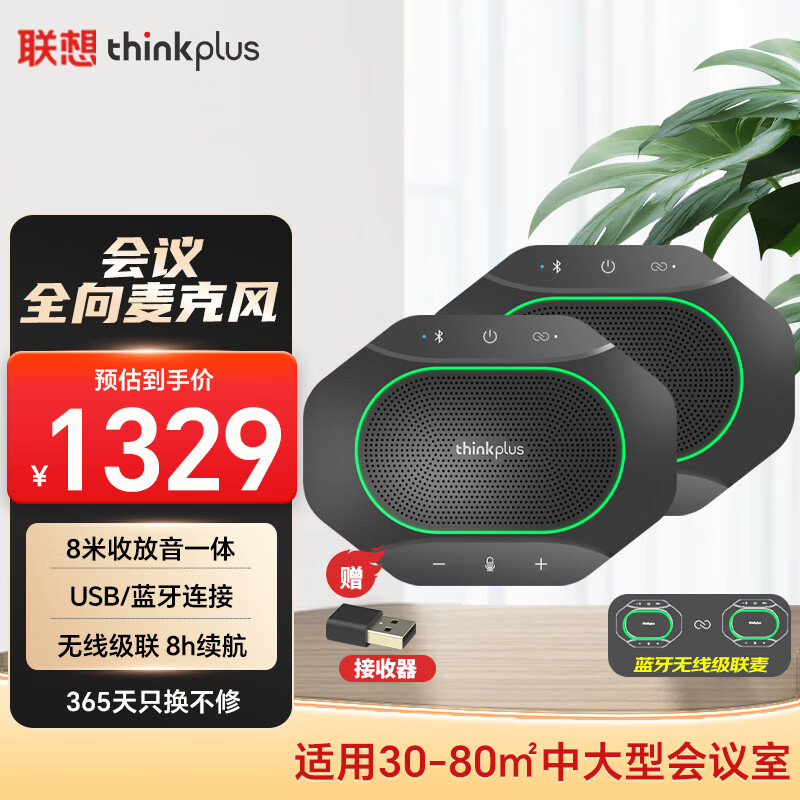 联想thinkplus视频会议全向麦克风8米拾音器免驱蓝牙无线级联同收同放桌面型扬声器30~80㎡MK-MC600*2价格:1329.00元!