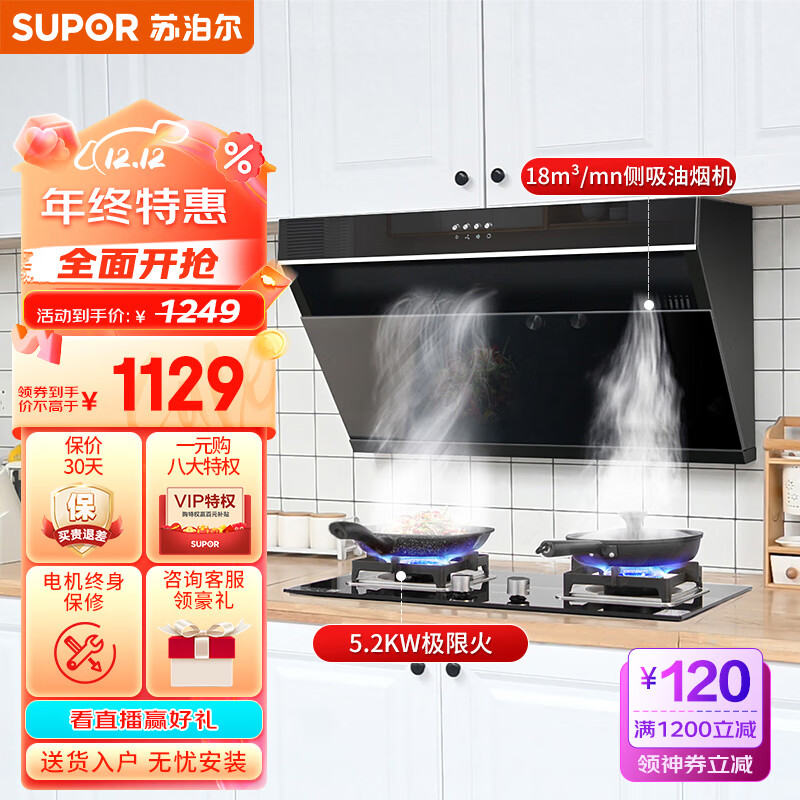 苏泊尔(SUPOR) 抽油烟机烟灶套装 18立方爆炒侧吸式家用吸油烟机燃气灶套装 DJ13+DB27天价格:1249.00元!
