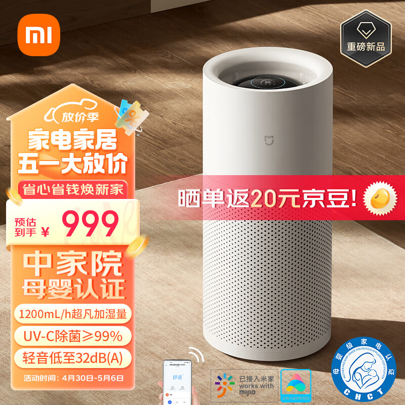 米家小米无雾加湿器3(1200) 卧室大容量家用办公室婴儿孕妇 1200ml/h快速空气加湿冷蒸发式 母婴认证价格:999.00元!