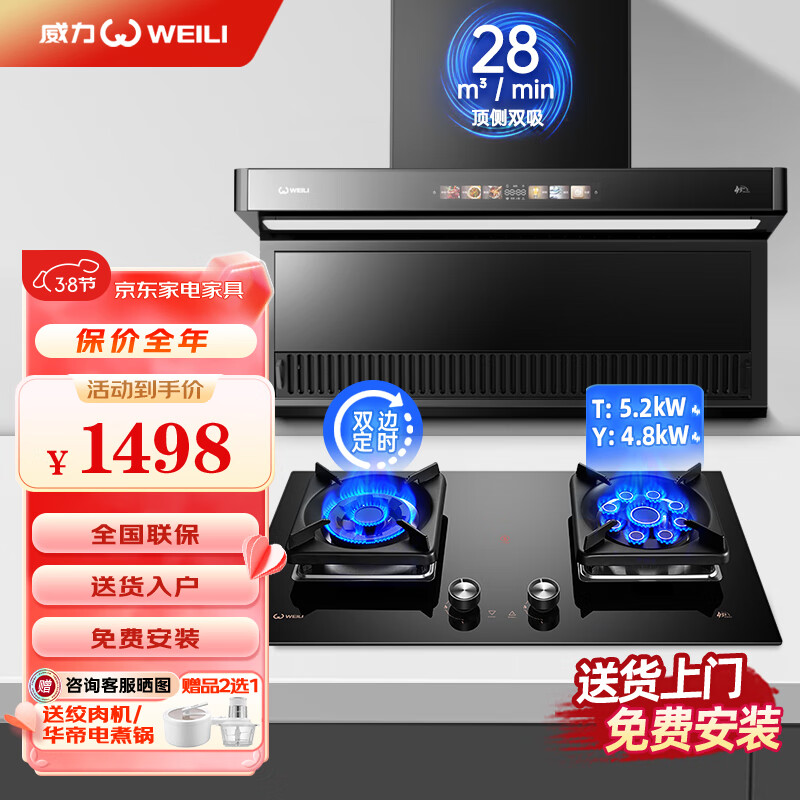 威力(WEILI)抽油烟机家用顶侧双吸油烟机灶具两件套28m3大吸力彩屏吸油机燃气灶套装WLQ07+WL311DJ(天然气)价格:1498.00元!