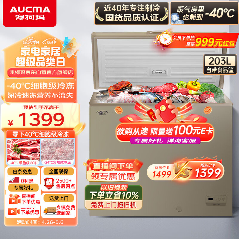 澳柯玛(AUCMA)203升零下40度超低温冰柜 囤货海鲜柜 电脑控温 家用商用大容量 一级能效BC/BD-203FNE 以旧换新价格:1499.00元!