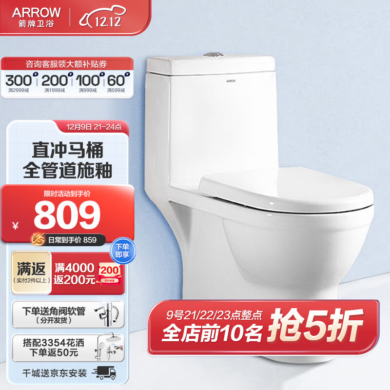 箭牌(ARROW)马桶家用直冲式坐便器大冲力座便坐厕 1级水效 全管施釉AEB12601L价格:1109.00元!