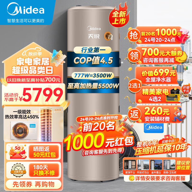 美的(Midea)空气能热水器家用200升包安装 超一级能效75℃高温水洗 R32冷媒电辅天悦RSJF-35/DN8-200C(E1)价格:5999.00元!