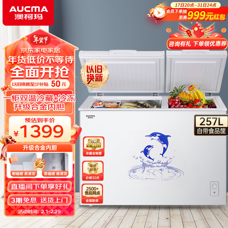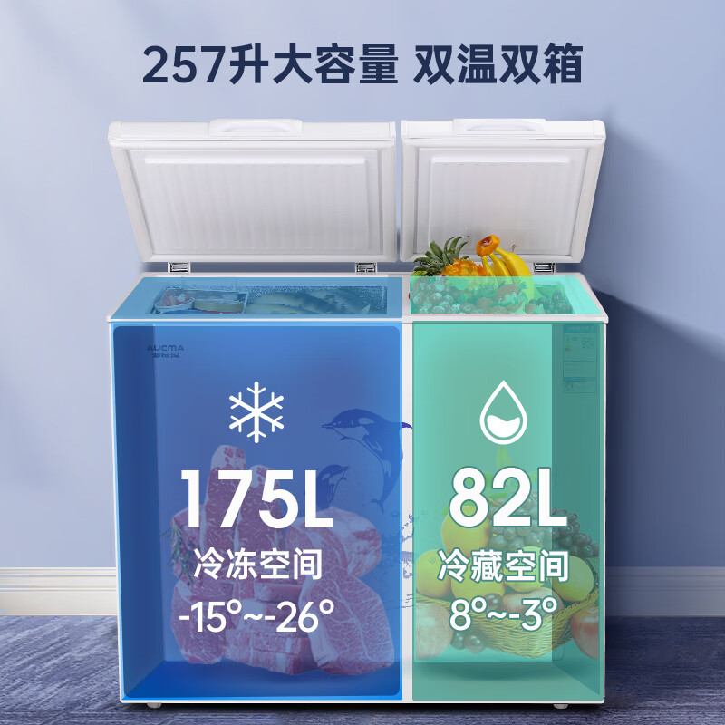 澳柯玛(AUCMA)257升家用冰柜 商用大容量冷冻柜冷藏柜 双温双箱卧式顶开门冷柜 一级能效省电 BCD-257CHN价格:1499.00元!