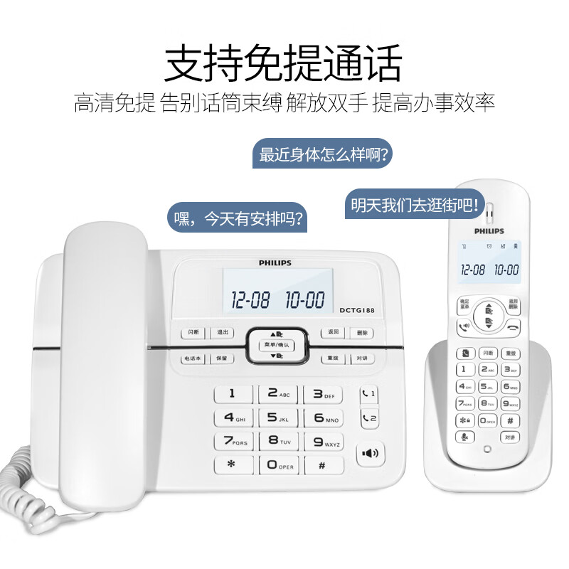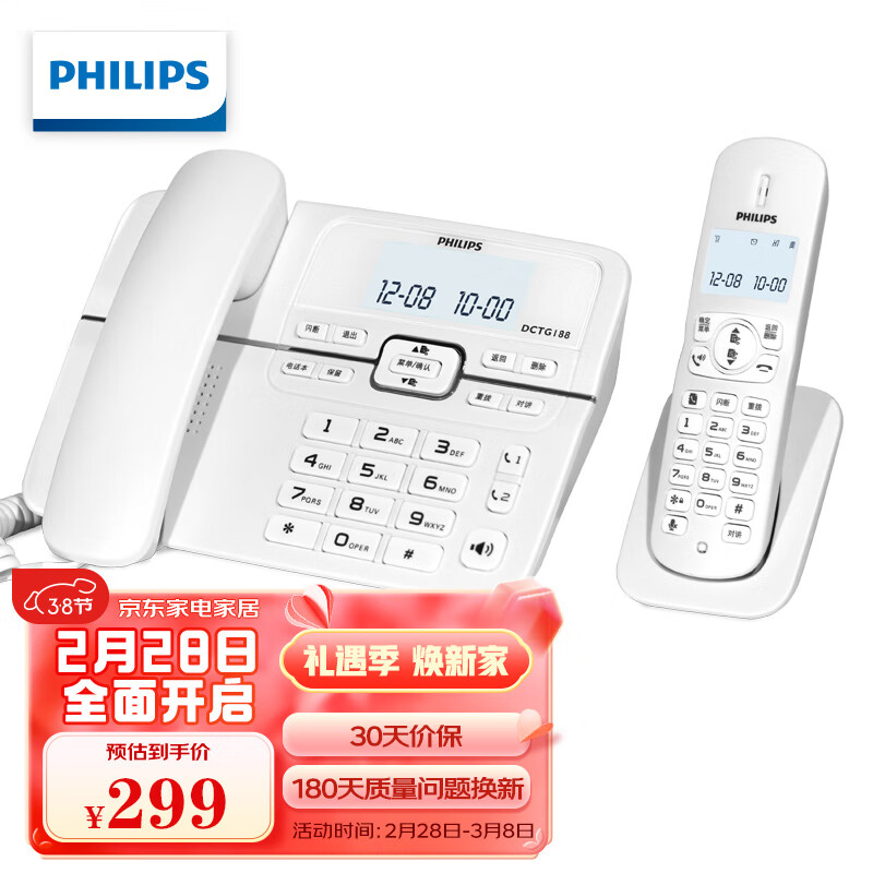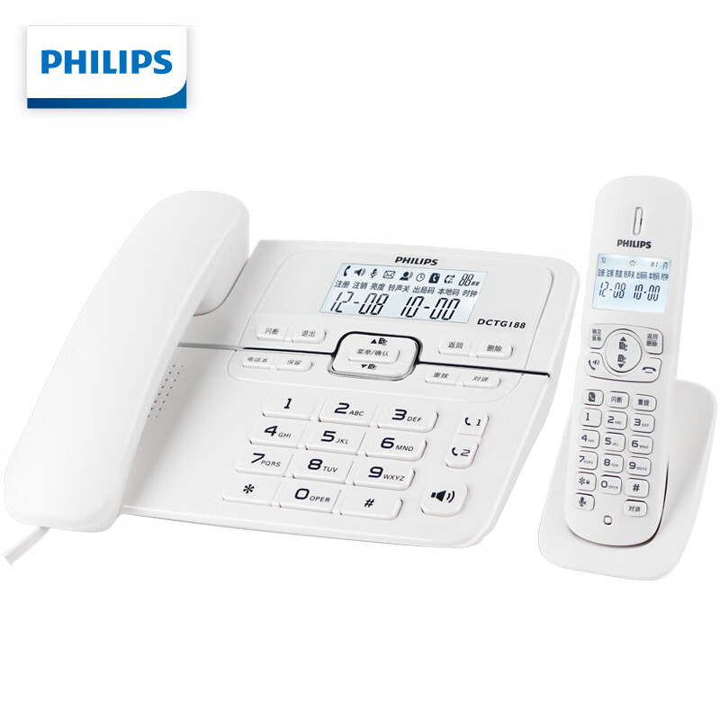 飞利浦(PHILIPS)数字无绳电话机 无线固定座机电话子母机办公家用 一键拨号/电话本 DCTG188一拖一 白色价格:299.00元!