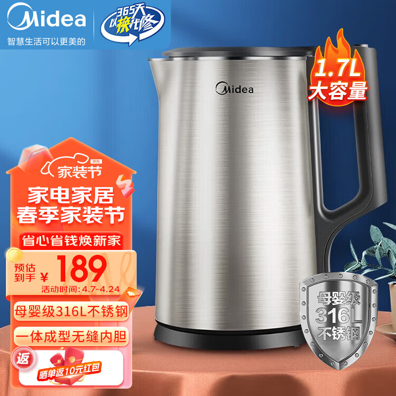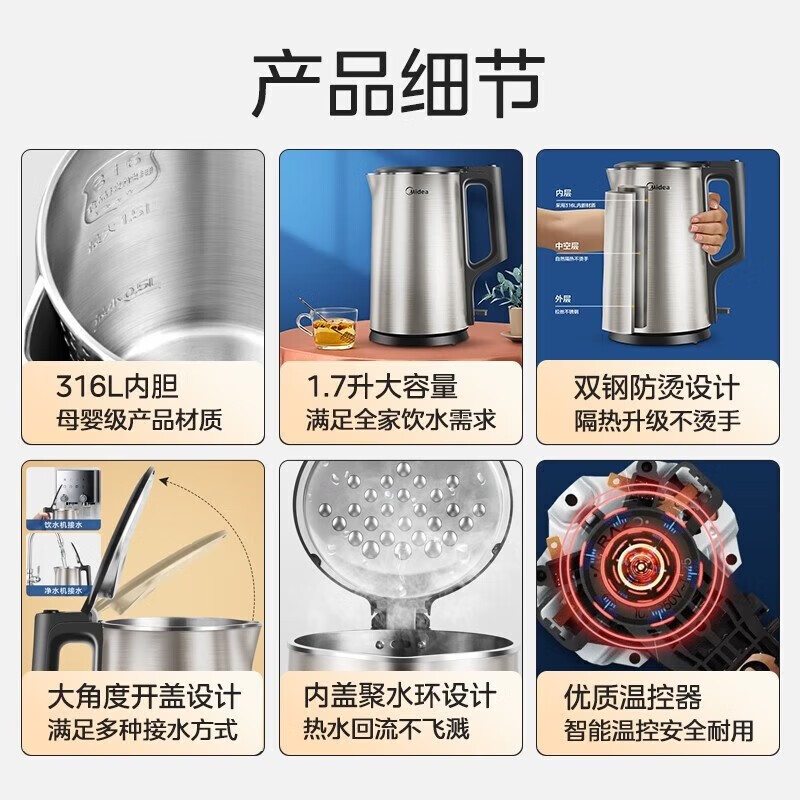 美的(Midea)电水壶家用烧水壶1.7升双层防烫防干烧316不锈钢热水壶 MK-PJ17A01大容量 1.7L价格:146.90元!
