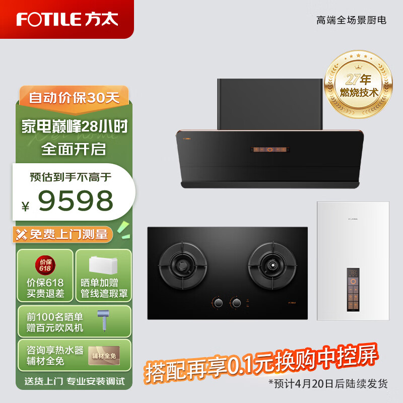 方太(FOTILE)家用厨房侧吸烟灶热三件套 24风量变频烟机 5.2kW防干烧燃气灶 17升热水器F1A+THK21B+X16F1价格:9598.00元!