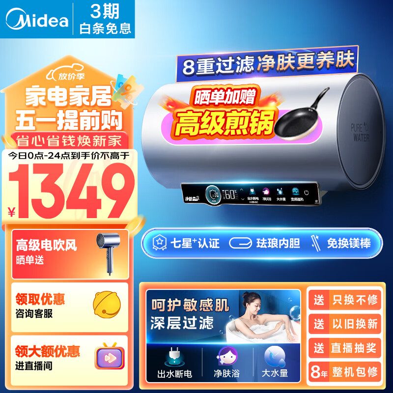 美的(Midea)净肤洗电热水器60升家用 3300W变频 出水断电 镁棒免更换 一级能效京东小家智能生态F6032-JA7(HE)价格:1449.00元!