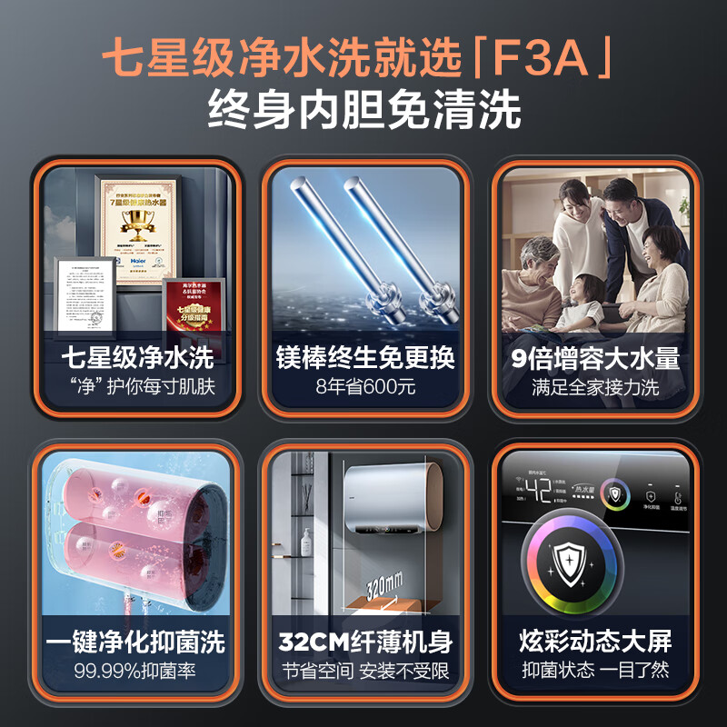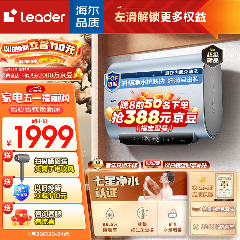 海尔智家出品Leader电热水器60升小仙镜扁桶净水洗镁棒免换3.3KW大功率速热一级能效LEC6001HD-F3A蓝U1价格:2199.00元!