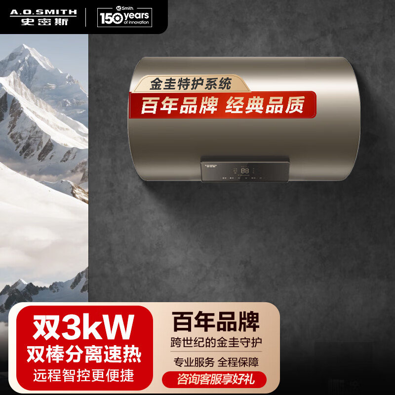 史密斯(A.O.SMITH)60升电热水器 金圭内胆 短款小尺寸 手机预约 双棒双3kW速热 E60VDP-B京东小家智能生态价格:3599.00元!