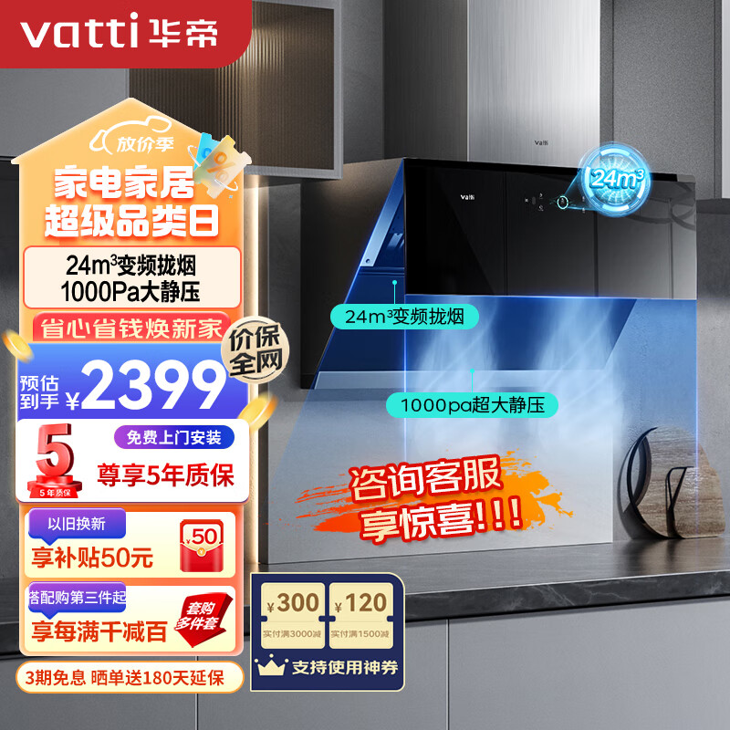 华帝(VATTI)变频大风压顶侧双吸油烟机 侧吸式家用抽油烟机 24立方大吸力 低噪静吸挥手智控自清洁 i11193价格:2399.00元!