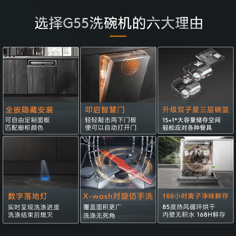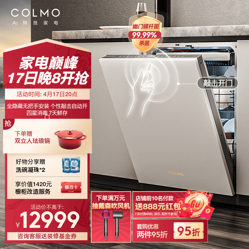 COLMO 15+1套全嵌入洗碗机 全隐藏无把手安装 高端敲击开门 数字落地灯 升级双子星三层碗篮 G55价格:12999.00元!