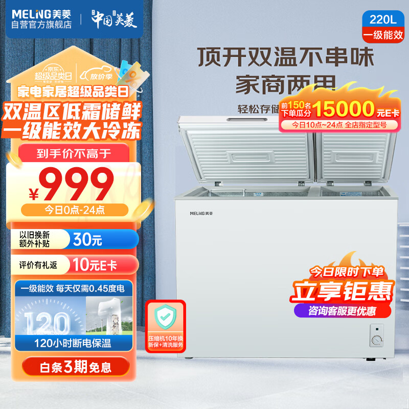 美菱(MeiLing)220升大容量家用商用冰柜 双箱双温冷柜 顶开门一级能效节能 冷藏冷冻卧式冰箱BCD-220DT以旧换新价格:999.00元!