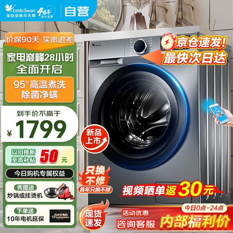 小天鹅(LittleSwan)滚筒洗衣机全自动10公斤家用大容量 1.08高洗净比 除菌净螨手机操控 以旧换新TG100YQ2价格:1719.00元!