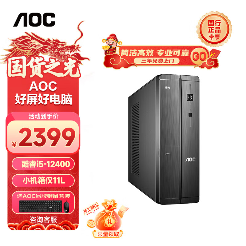 AOC 荣光910 商务办公台式电脑主机(酷睿12代i5-12400 16G 512G wifi 商务键鼠 三年上门)价格:2399.00元!