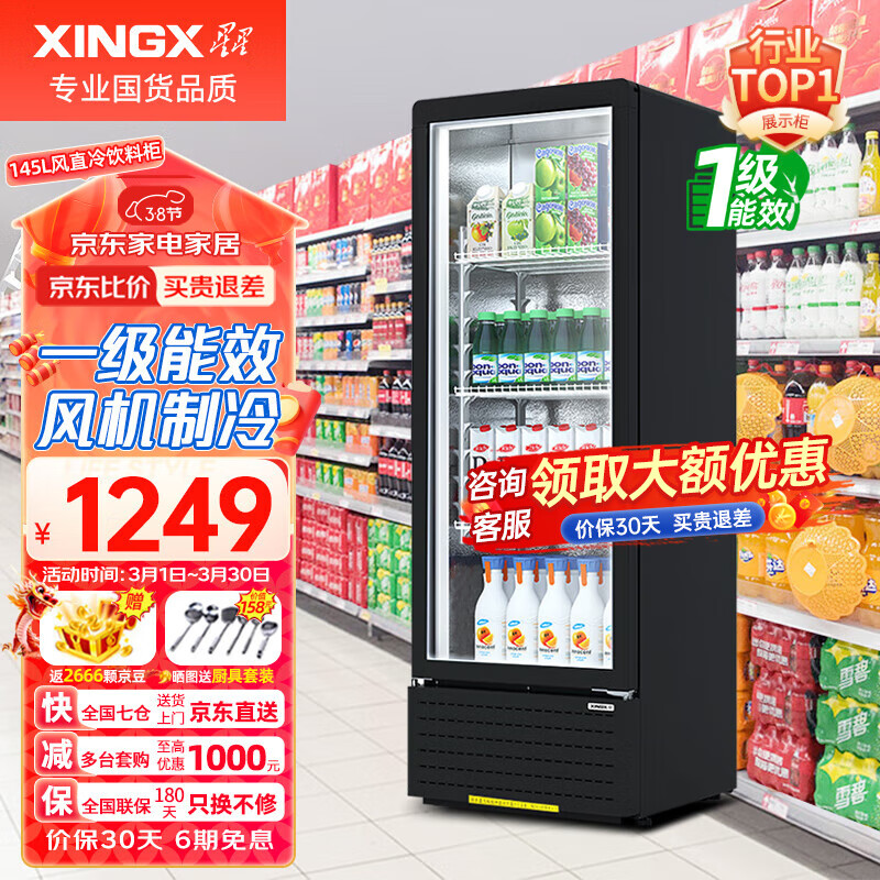 星星(XINGX)展示柜冷藏饮料柜一级能效单门立式冰柜商用保鲜冰箱风冷直冷超市便利店陈列柜啤酒水果柜 风直冷减霜 1级能效145升LSC-150FYPE价格:1249.00元!