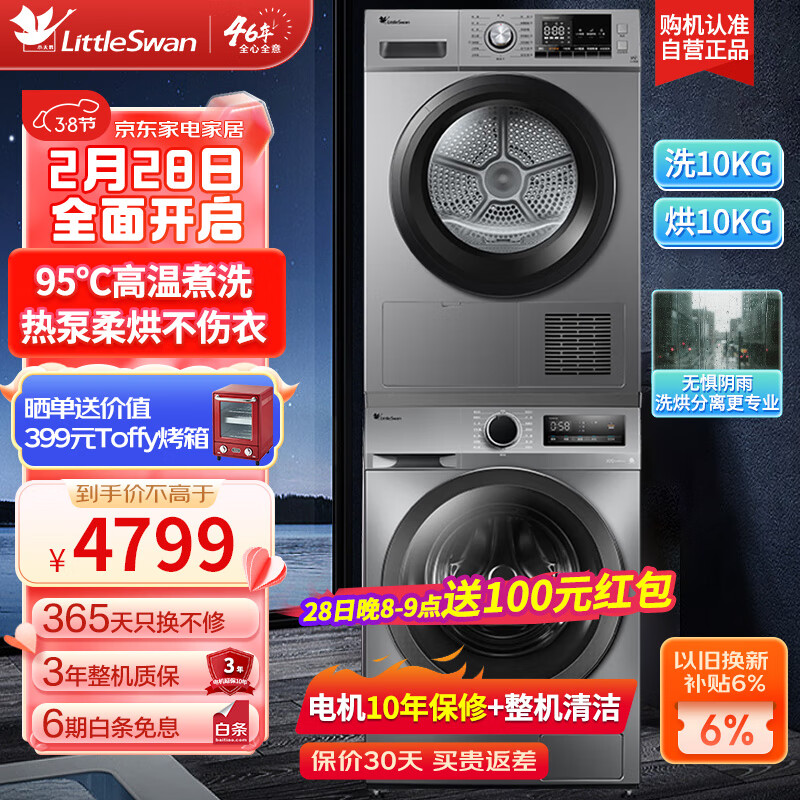 小天鹅(LittleSwan)洗烘套装热泵烘干 全自动滚筒洗衣机烘干机10KG大容量智能家电高温煮洗 以旧换新YQ2+H03WY价格:4799.00元!