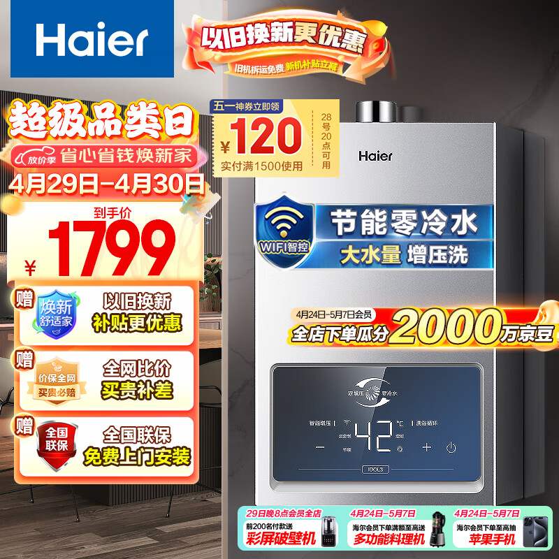 海尔(Haier)16升燃气热水器天然气大水量增压洗零冷水 AI自学习节能家用WIFI遥控智能防冻 JSQ30-16IDOL3-TU1价格:1899.00元!