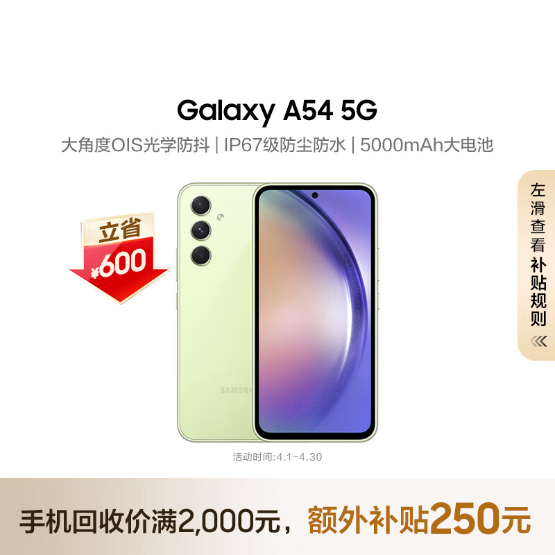 三星 SAMSUNG Galaxy A54 5G手机 大角度OIS光学防抖 IP67级防尘防水 5000mAh大电池 8GB+128GB 鲜柠绿价格:2399.00元!