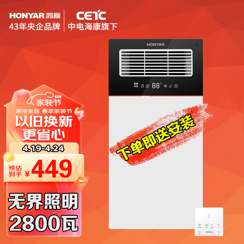 鸿雁双电机风暖浴霸大照明无边框集成吊顶灯卫生间浴室暖风机QF12717Z价格:898.00元!