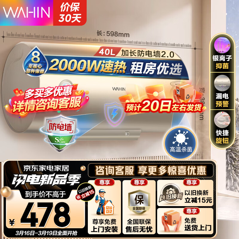 美的(Midea)出品储水式电热水器40升出租屋大功率家电速热节能卫生间洗澡加长防电墙华 凌F4020-KY1(H)价格:478.00元!