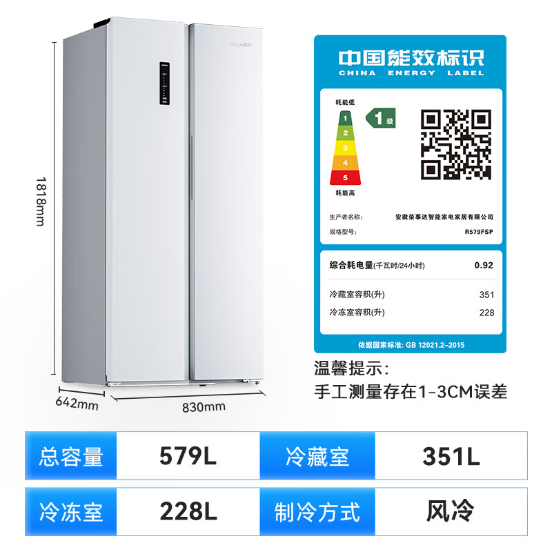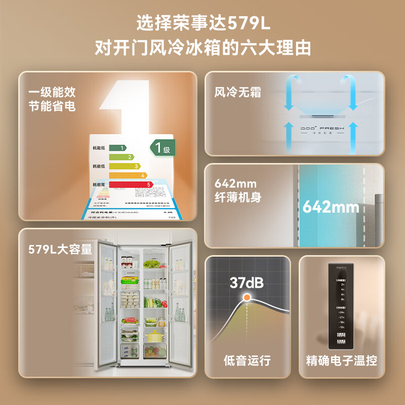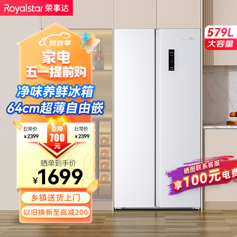 荣事达(Royalstar)579升双变频风冷无霜一级能效对开门双开门家用超薄嵌入大容量保鲜除菌净味电冰箱R579FSP价格:1799.00元!