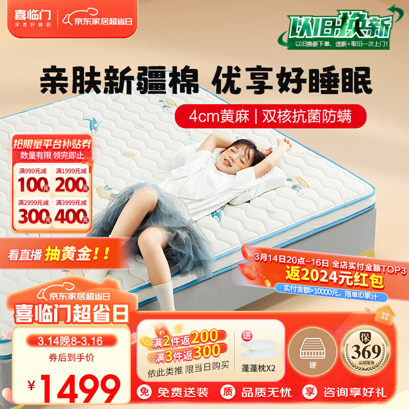喜临门床垫 4cm黄麻薄床垫 抑菌防螨青少年老人床垫 诺蓝8H 1.8*2.0m价格:1599.00元!