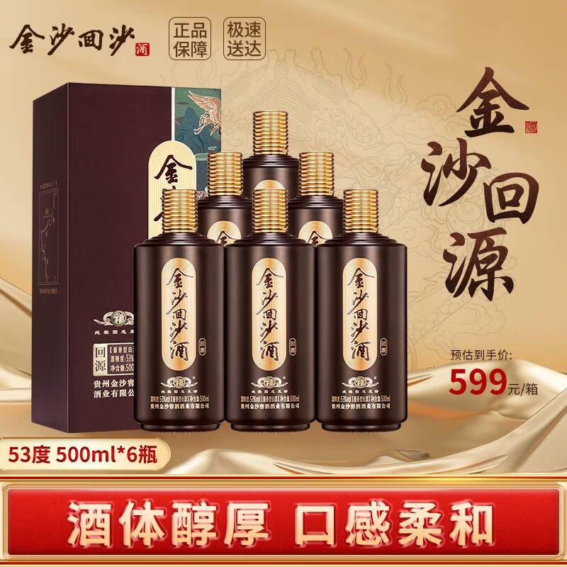 金沙回沙酒 回源53度 酱香型白酒 500ml*6瓶 整箱装价格:654.00元!