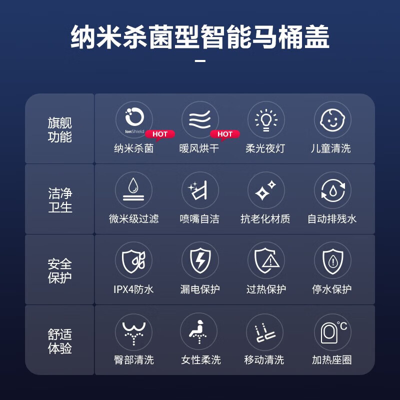 功能:暖风烘干,臀部清洁,座圈加热,喷嘴自洁,喷嘴移动清洗,女性清洗,儿童清洗,记忆功能,净化水质